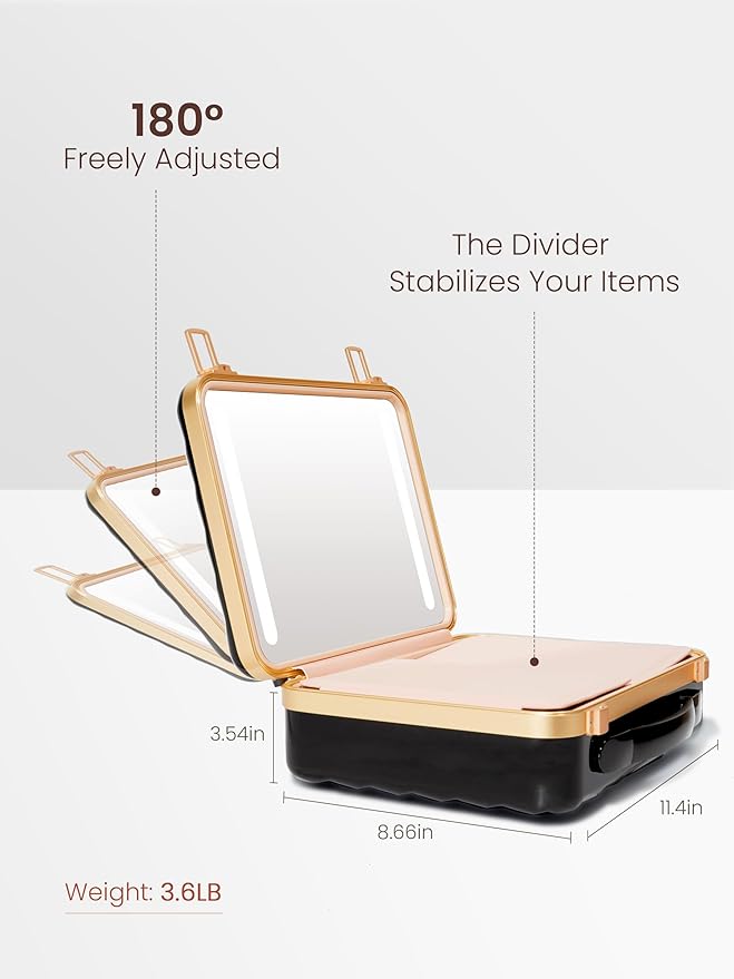 - 【New upgrade portable makeup case】Large capacity cosmetic storage compartment, large makeup brush storage board, and a 4K silver-plated makeup mirror. This perfectly integrated makeup case and makeup mirror combination allows you to take your dressing table everywhere with you, whether you're traveling or out on business. Weighing just 3.6LB and measuring 11.4*8.66*3.54in, it's compact and lightweight, making it the perfect travel companion for beauty lovers and fashionistas