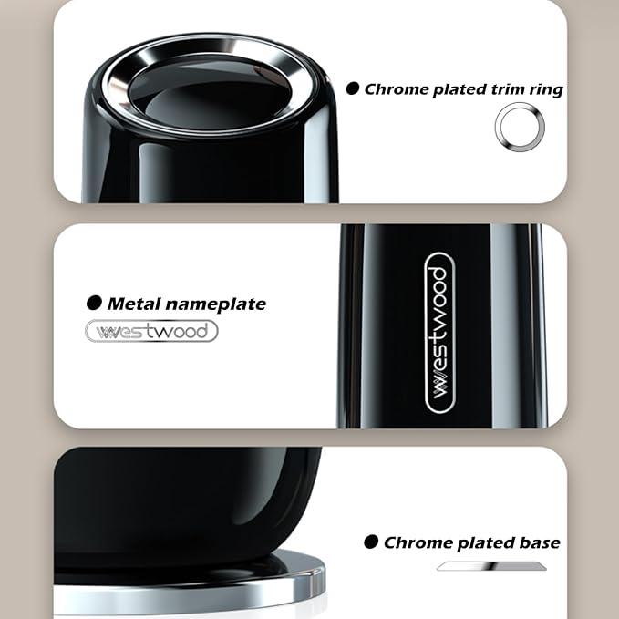 - 【Stylish Chrome Accents】Metal film coating decoration with chrome plated trim ring on the head, metal nameplate on the body, chrome plated base at the bottom. Features durable chrome-plated trim ring, nameplate, and a stable weighted base for secure standing