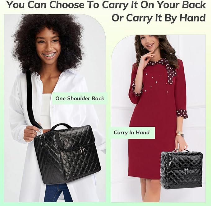 - 【Best Choice and Ideal Companion】11 x 7.7x 10.8 inches, this carry makeup bag is an ideal size for your daily needs on the go, it can not only be used as a nail tools bag organizer, but also can be used as women's makeup and travel bag. Our travel case not only can storage your cosmetics, such as storing your lipstick, lip gloss, makeup palettes, hair brushes, skin care products, nail polish, and so on, but also Jewelry, electronic accessories, camera, essential oil, toiletries.