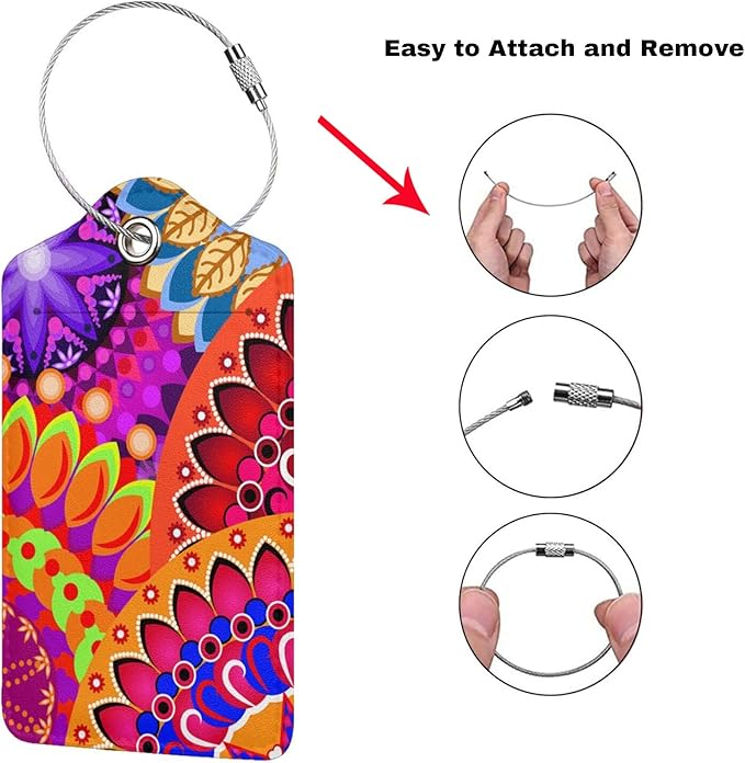 Colorful Mandala Style Luggage Tags Bright Red Bag Tag with Full Back Privacy Cover Name ID Card Stainless Steel Loop Suitcase Labels Address Card PU Leather Baggage Tags Luggage for Travel, 2 Pcs