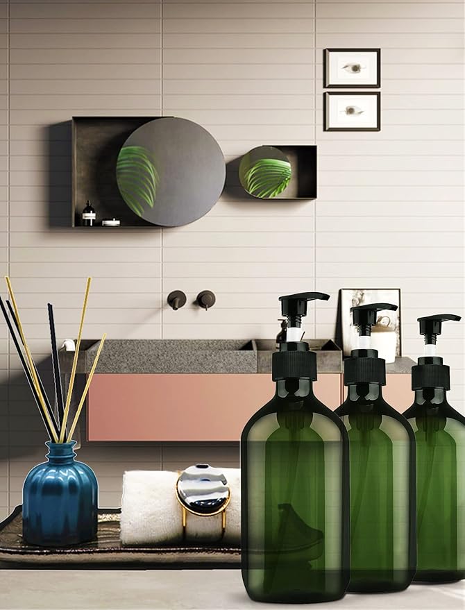 Empty Plastic Bottles with Pump Dispenser and Labels Included, Refillable Travel Containers for Hand sanitizer Shampoo Lotion, etc - No BPA/Parabenf, 500ml/16.9oz (Green, 3 Pack)