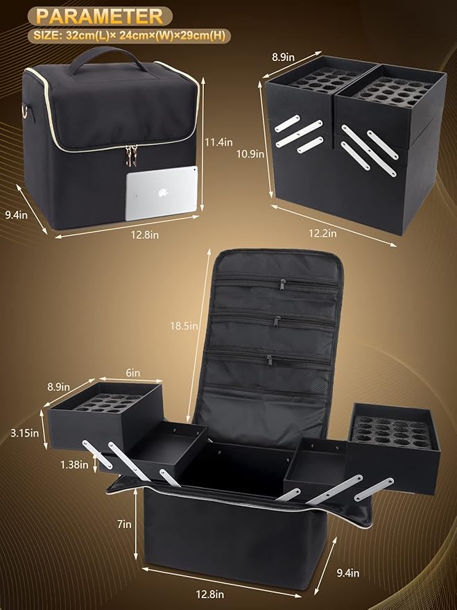 - 【Professional Travel Makeup Bag With 4 Tier Retractable Dividers】: The first layer of tray is designed with heightening and sponge slot, which makes it easy to put nail polish vertically, and nail polish can be well preserved to avoid collision, damage or leakage. Large nail dryer can be put into the spacious bottom. Built in 3 zipper netpockets for storing lipstick, makeup brushes and other makeup.