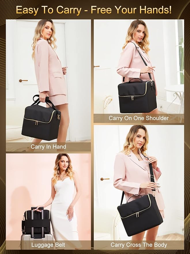 - 【Easy To Carry - Travel Essentials】: This large cosmetic bag makeup box organizer design with detachable and adjustable shoulder strap and a luggage belt is added on the back to let the bag hang on your luggage, which can free your hands. Portable carry handle for easy lifting or hanging. The wide handle design can evenly distribute the force and make it comfortable to hold. Perfect for travel, business trip, nail salons use, DIY manicure at home!