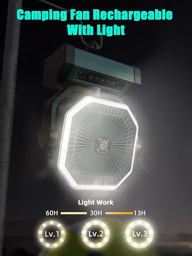 - PORTABLE CAMPING FAN WITH Light & Hook: This camping fan battery powered offers 58 LED beads, 3 dimmable brightness functions for different occasions. Great portable fan for bedroom, Office, Camping, RV, Power Outage, Rtc. The 2-in-1 portable outdoor fan has a 360° rotating hidden hook so you can hang the fan up and adjust the right angle. In addition, it is also suitable for use indoors as a large battery operated fan. This would be a great gift for your family and friends.