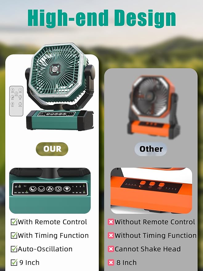 Portable Rechargeable Fan - 9-Inch Camping Fan for Tent, 20000mAh(60Hrs) Battery Operated for Camping, Auto Oscillation Cordless, Tent Fan with Remote/Light, 4 Speeds, 4 Timing, Outdoor