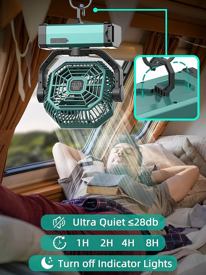 - USB FAN CAMPING WITH SLEEP TIMER: This rechargeable camping fan has a sleep timer to help you set the working time, The battery operated fan camping doesn't have to run all day or all night (can be timed to 1H, 2H, 4H, 8H), Also you can set the sleep mode will turn off all the lights to help keep it dark and better sleep, Thanks to its powerful and super quiet feature, This portable battery fan runs with the lowest white noise (<28db) Let you get maximum comfort.
