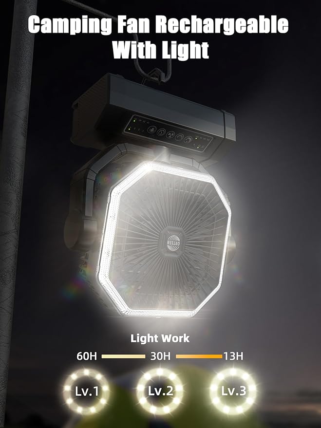 - PORTABLE CAMPING FAN WITH Light & Hook: This camping fan battery powered offers 12 LED beads, 3 dimmable brightness functions for different occasions. Great portable fan for bedroom, Office, Camping, RV, Power Outage, Rtc. The 2-in-1 portable outdoor fan has a 360° rotating hidden hook so you can hang the fan up and adjust the right angle. In addition, it is also suitable for use indoors as a large battery operated fan. This would be a great gift for your family and friends.