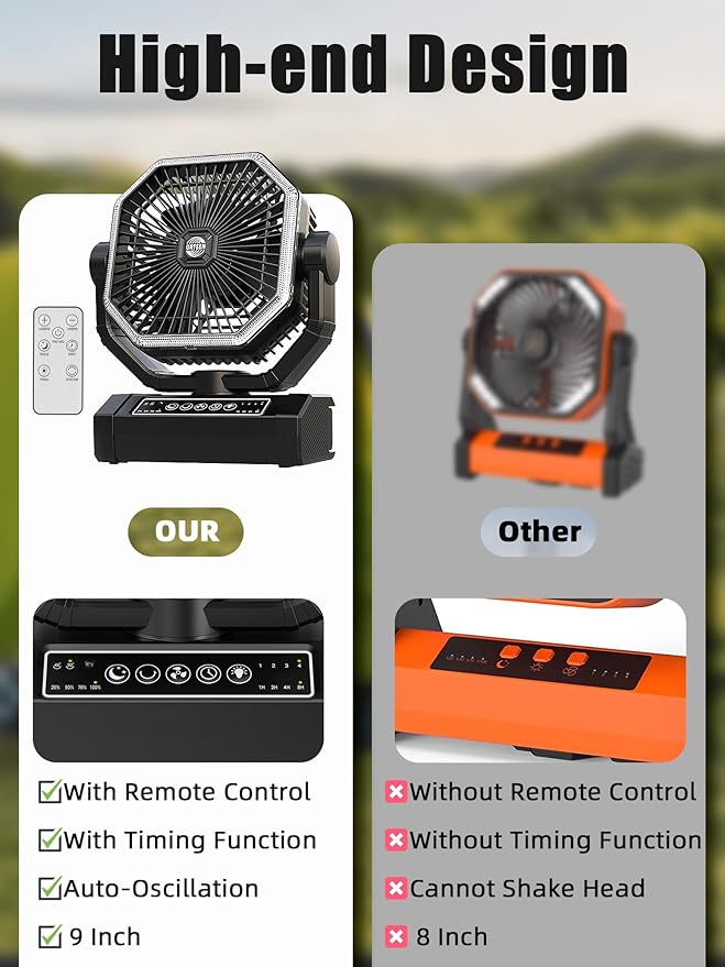 Portable Rechargeable Fan - 9-Inch Camping Fan for Tent, 20000mAh(60Hrs) Battery Operated Fan for Camping, Auto Oscillation Cordless Fans, Tent Fans with Remote/Light, 4 Speeds, 4 Timing, Outdoor