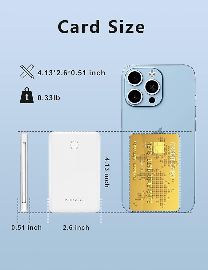 - Credit Card Size: They are the slimmest and the smallest of MIISSO portable chargers with cables, only 0.27lb(122g) and their body like a credit card. The lightweight design let you take it out without pressure. It's slim enough to put it in your pocket or in your handbag