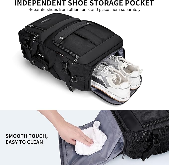 - Multi Pocket Design: 1 main top U-shaped zipper pocket with 2 open pockets, 1 charging pocket, 1 large zip pocket, 1 17 inch laptop pocket and ipad pocket inside; 4 front zipper pocket, front medium zip pocket with 2 open pockets and 2 pen pocket inside;1 bottom shoe compartment; 1 side mesh pocket and side buckle can place sleeping bag, etc;1 zipper pocket on the back that hides the backpack strap to convert briefcase, travel laptop bag.