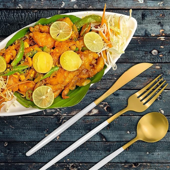 - Gold silverware set has stylish and excellent shape, removing the problem of the noodle handle being too heavy and overturning. The appropriate weight and comfortable feel of the flat and slim handle provide comfortable grip for children and adults. For those who don't like heavy silverware, this fashionable cutlery set with the slim handle is the good choice.