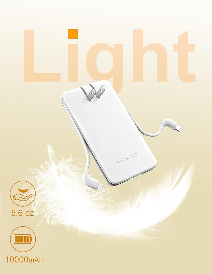 miisso Ultra Slim 10000mAh Power Bank Built-in Cables and Foldable AC Wall Plug, Pocket Size USB C Portable Charger, External Battery Pack Compatible with iPhone Samsung iPad etc, White