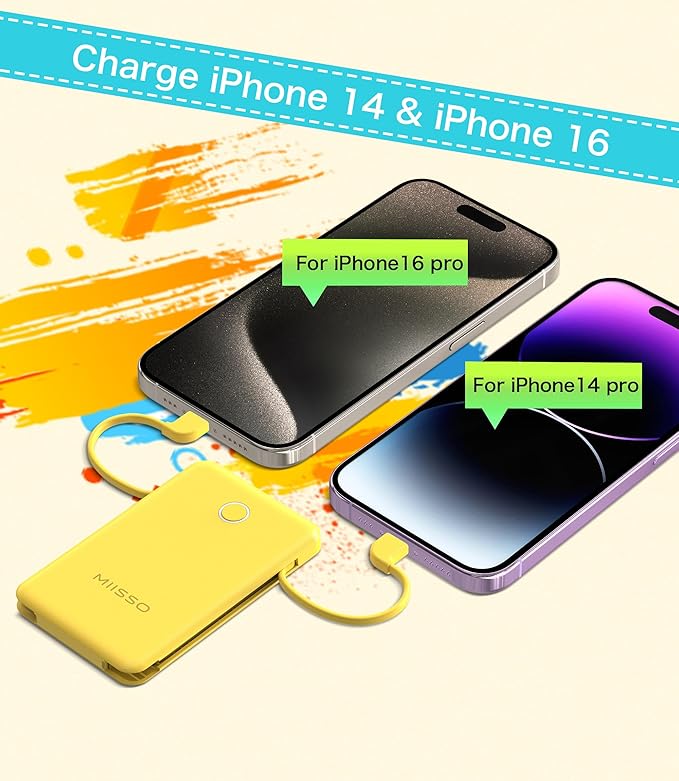 miisso 6000mah Ultra Slim Built in Cables Power Bank, Card Size Built in USB C Cords Battery Pack Portable Charger for Phones, 3 Output External Battery Pack Compatible with iPhone, Yellow
