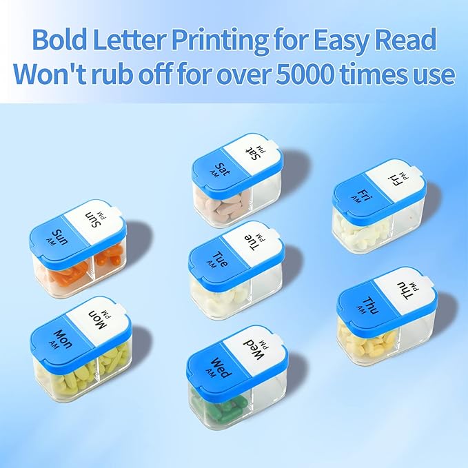 - Excellent Printing Pill Organizer - Printing has passed the critical 3M adhesives & tapes test, won't rub off over 5000 times of use. Total 13 x 3 x 3 inches and 1.7 x 1.6 x 3 inches big space for each compartment, please note this weekly pill organizer is perfectly BIG for who need an extra large pill organizer to fit all of medications and vitamins