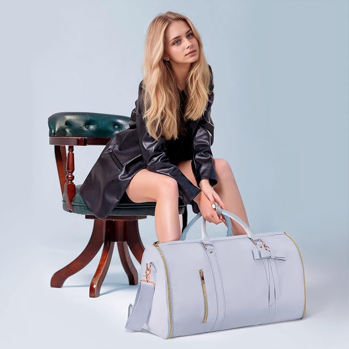 Garment Bags for Travel, Convertible Suit Travel Bag for Women, Stylish Carry On Garment Bag with Toiletry Pocket, Shoulder Strap and Shoes Compartment, 2 in 1 Foldable PU Leather Duffle Bag, Blue