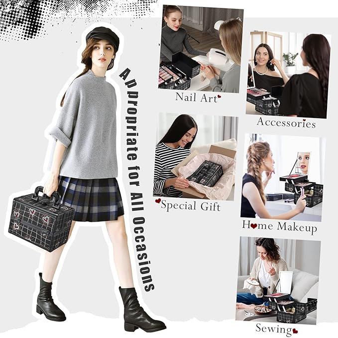 - Y2K Punk-inspired Makeup Case: The size of the travel makeup case is 9.44 x 6.69 x 7 inches. It is suitable for makeup artists from beginners to professionals. ABS aluminum and metal reinforced corners have good wear resistance and are lightweight and durable. With its waterproof surface, the makeup case is an excellent protection for outdoor cosmetics.