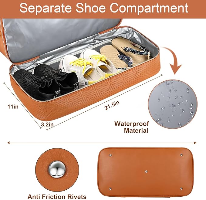 - Waterproof Separate Shoe Compartment: The shoes compartment of this travel duffle bag is fashioned with PVC waterproof materials to facilitate carrying your shoes during travel. This compartment can also be used to hold dirty clothes or wet towels, separating wet and dry to prevent your clean luggage from getting soiled or wet. Shoes compartment size: 21"Lx11"W*3.2"H and can fit up to 3 pairs of shoes. The thicker bottom can better carry weight.