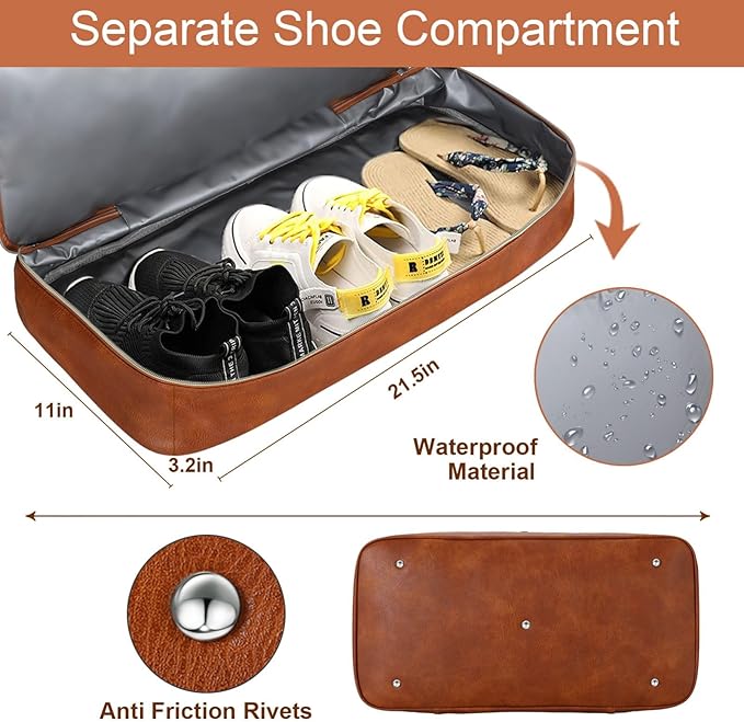 • Waterproof Separate Shoe Compartment: The shoes compartment of this travel duffle bag is fashioned with PVC waterproof materials to facilitate carrying your shoes during travel. This compartment can also be used to hold dirty clothes or wet towels, separating wet and dry to prevent your clean luggage from getting soiled or wet. Shoes compartment size: 21"Lx11"W*3.2"H and can fit up to 3 pairs of shoes. The thicker bottom can better carry weight.