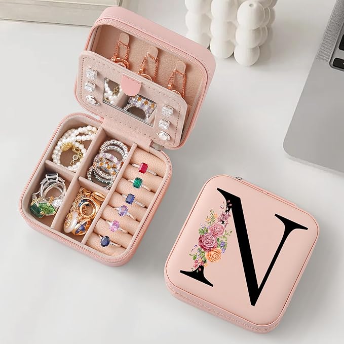 Parima Christmas Stocking Stuffers Gifts Jewelry Case Organizer Travel Jewelry Box - Holder Ring Earrings Box for Women, Birthday Gifts for Teenage Mom Bridesmaid Maid of Honor - Letter N, Pink