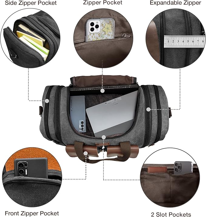- 【Retro & Classic】Selected high-density nomadic canvas, thick leather and brass hardware makes this travel bag both retro and durable. Leather handle with metal buttons for comfortable carrying. It can be used as a handbag, messenger bag and backpack, stylish and classic.