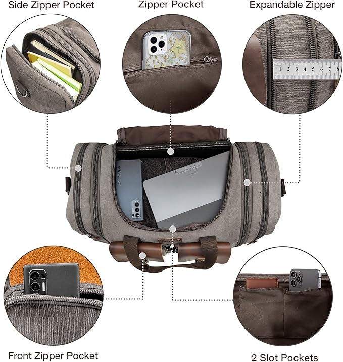 Wildroad 60L Travel Duffel Bag, Expandable Canvas Genuine Leather Duffle Bag Upgraded Overnight Weekender Bag Carry on Bag