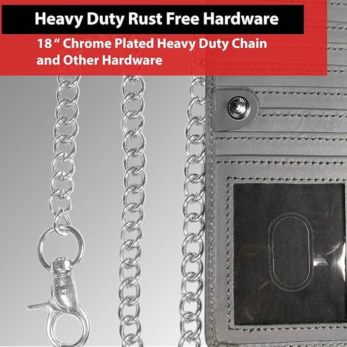 - RUST FREE HEAVY DUTY METAL CHAIN: Designed for durability and style, this motorcycle wallet for men comes with a premium 18" removable metal chain featuring a secure dog lock clasp. Engineered to resist rust and wear, it easily attaches to your belt loop to keep your wallet safe, secure, and always within reach. Perfect for bikers, truckers, travelers, or anyone who demands rugged reliability with a bold, masculine look.