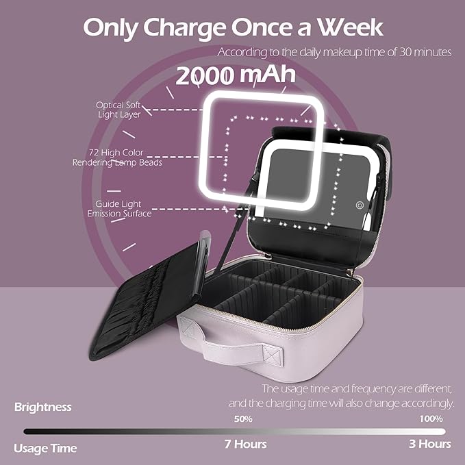 MOMIRA Travel Makeup Bag Cosmetic Bag Makeup Organizer Bag with Lighted Mirror, Adjustable Brightness in 3 Color Scenarios, Waterproof Makeup Train Case, Gift for Women - Violet grey