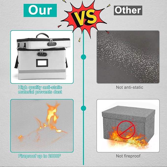- PORTABLE FIREPROOF STORAGE BOX: Document organizer with lighter and sturdy handles, our fireproof box can be moved and carried more easily. You can use it in many places like home, office, car or outdoor activities. The inside of the filing box is supported by PP material, which is not easy to deform, so you can easily fold or stack multiple boxes together.