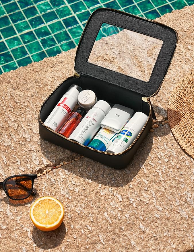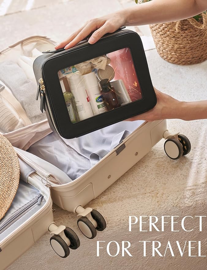 - [Premium Material and Durability] – The clear cosmetic case, both the exterior and interior, is crafted from high-grade saffiano faux leather, which is highly scratch resistant, durable and exceptionally easy to keep clean. It features a smooth zipper for secure closure, and elegant light gold metal hardware accents, adding a luxurious and sophisticated touch to the bag's overall design.