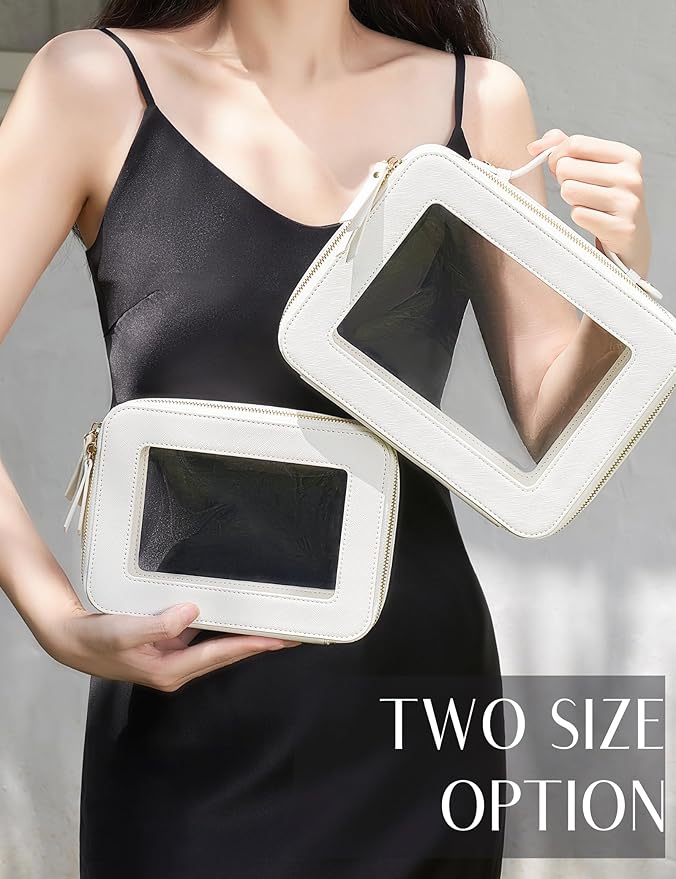 - [Premium Material and Durability] – The clear cosmetic case, both the exterior and interior, is crafted from high-grade saffiano faux leather, which is highly scratch resistant, durable and exceptionally easy to keep clean. It features a smooth zipper for secure closure, and elegant light gold metal hardware accents, adding a luxurious and sophisticated touch to the bag's overall design.