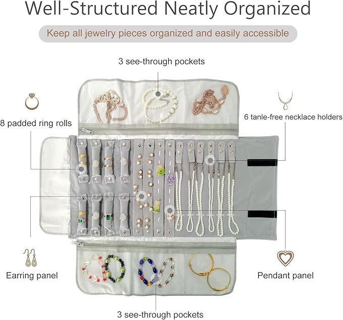 - Large-capacity jewelry roll: With 6 necklace/bracelet holders, 8 rings rows, 4 earring holders, and 6 PVC pockets on both sides, this jewelry roll offers ample space for all your jewelry essentials