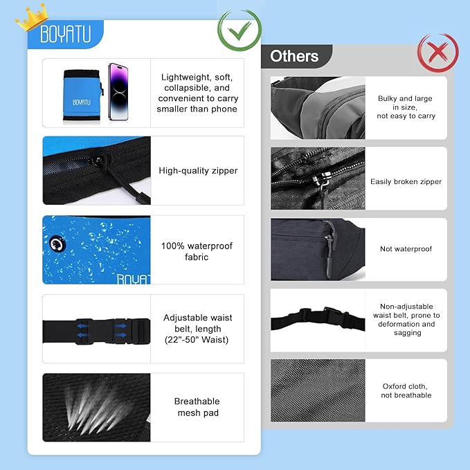 - Reflective and Waterproof: Safety's key with our waist pack's four reflective strips, keeping you visible during those late-night or early morning runs. And if it starts to rain, no sweat your phone, headphones, keys,cards and cash stay safe and dry.
