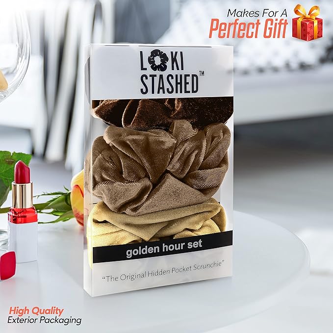 3-PACK Velvet Hair Tie Scrunchies for VSCO Girls & Women, THE ORIGINAL HIDDEN POCKET SCRUNCHIE with Zipper Pocket Storage, Accessories, Small Items, Keys, Money (Golden Hour Set)
