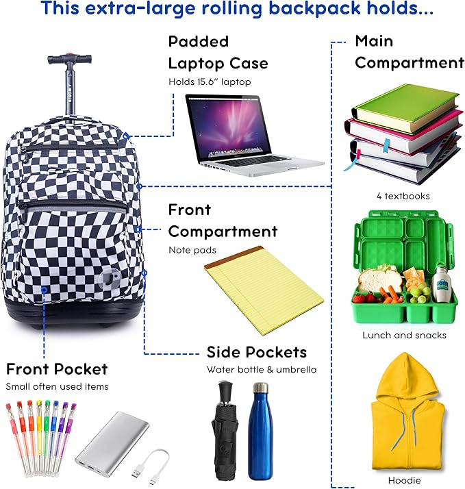 J World Sundance Laptop Rolling Backpack for Girls Boys. Roller Bookbag with Wheels, Wavy Checkers