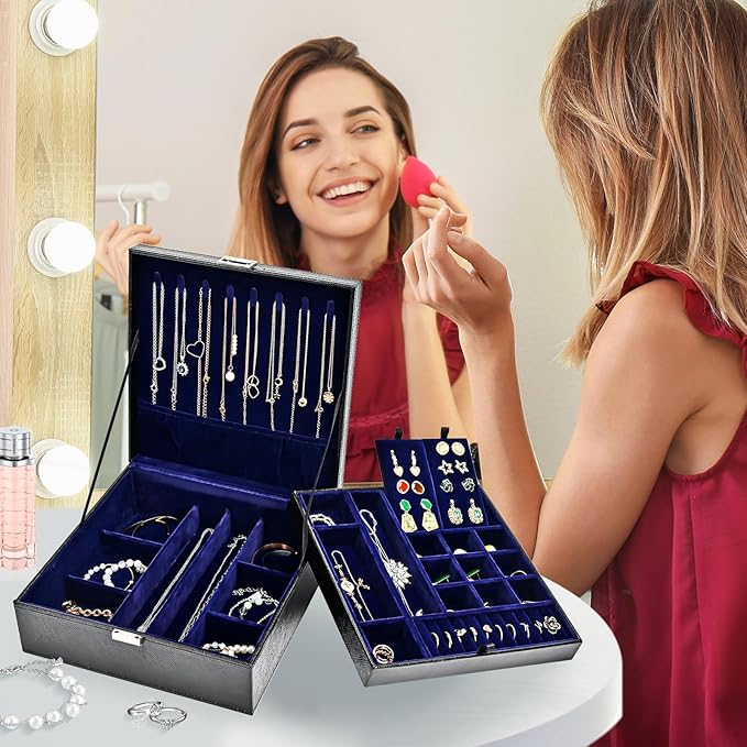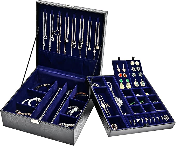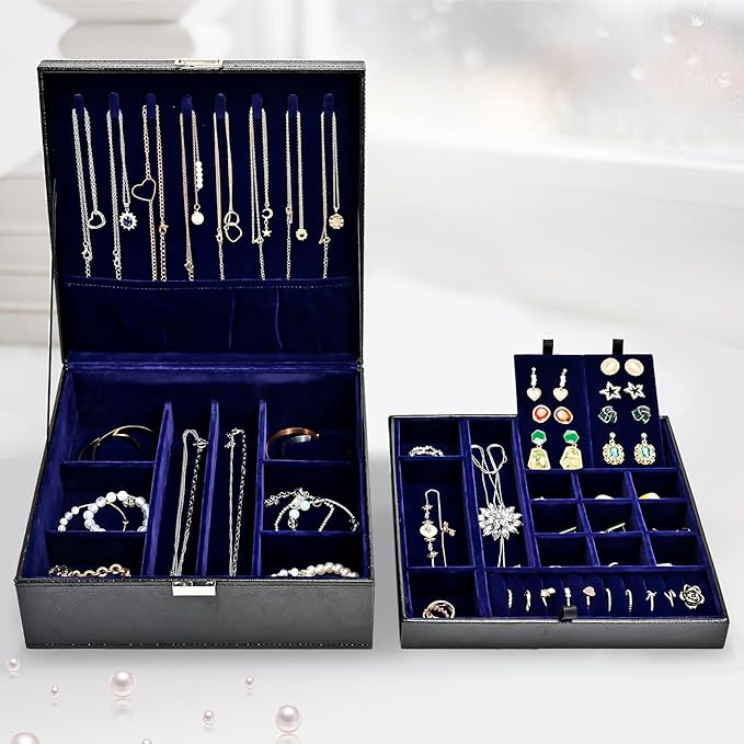 - Double-layer Stackable Storage: spacious storage room, built with necklaces hanging hooks, slots and compartments in different sizes for various jewelries