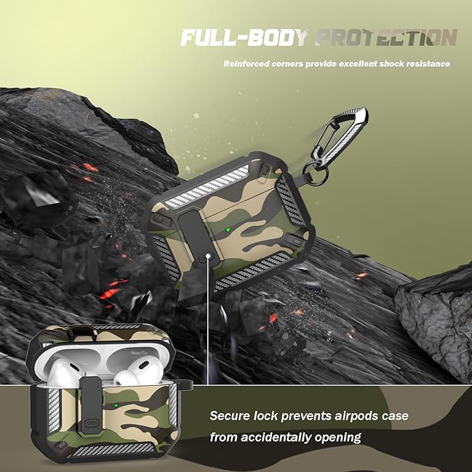 RFUNGUANGO for AirPods Pro 2nd Generation Case Cover with Cleaner Kit, Military Hard Shell Protective Armor with Lock for AirPod Gen 2 Charging Case 2022, Front LED Visible,Black Camou
