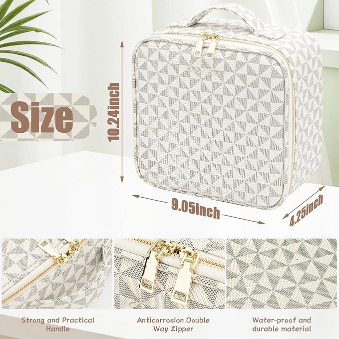 - 【Premium Material】The vanity case is made of delicate synthetic leather surface, waterproof and wear-resistant, ergonomic handle, electroplated light gold zipper is anti-corrosion, not easy to fade.