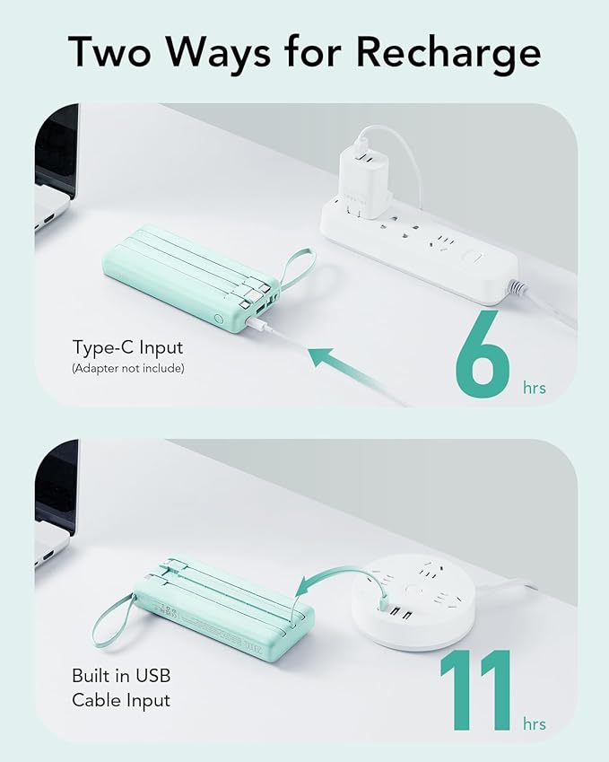 - 【Two Ways for input】More convenient to recharge at any time with built-in usb-a cable, connect the socket with USB-A port to directly charge powerbank itself. or recharging through 18W usb-c port will more fast full charging in 6 hrs. (Note: this power bank appr 6 hours recharge (by 9V/2A Power adapter through usb c input port) appr 11 hours full recharge(by 5V/2A built in USB cable input) .