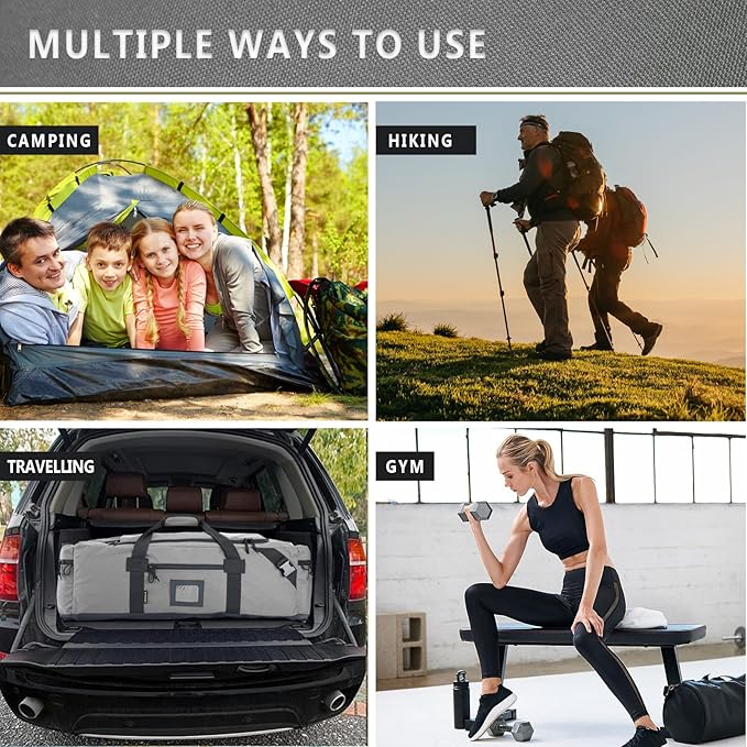 - MULTIPURPOSE: canvas gym duffle bag is suitable for both men and women and can be used as a weekender bag, large backpack for travel, sports equipment storage, car equipment bags, Family Storage Bag,deployment bag,or simply as a large duffle bag for Great for customers who like camping, outdoor sports, family travel,etc