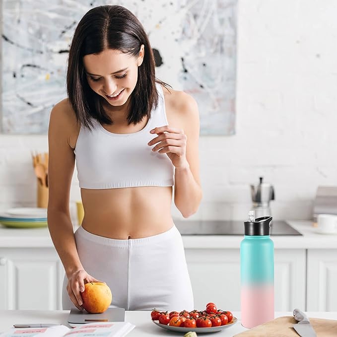 VEGOND 40 oz Insulated Water Bottle Stainless Steel Metal Water Bottles with Leak Proof Straw Lid & Spout Lid, Wide Mouth Double Walled Vacuum Travel Sports Bottle Cup, Green Pink