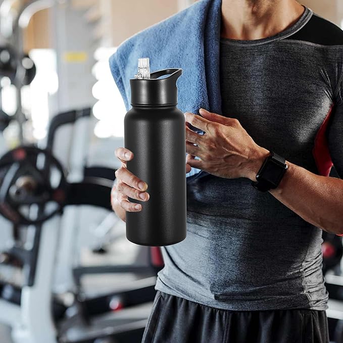 VEGOND 32 oz Insulated Water Bottle Stainless Steel Metal Water Bottles with Leak Proof Straw Lid & Spout Lid, Wide Mouth Double Walled Vacuum Travel Sports Bottle, Black