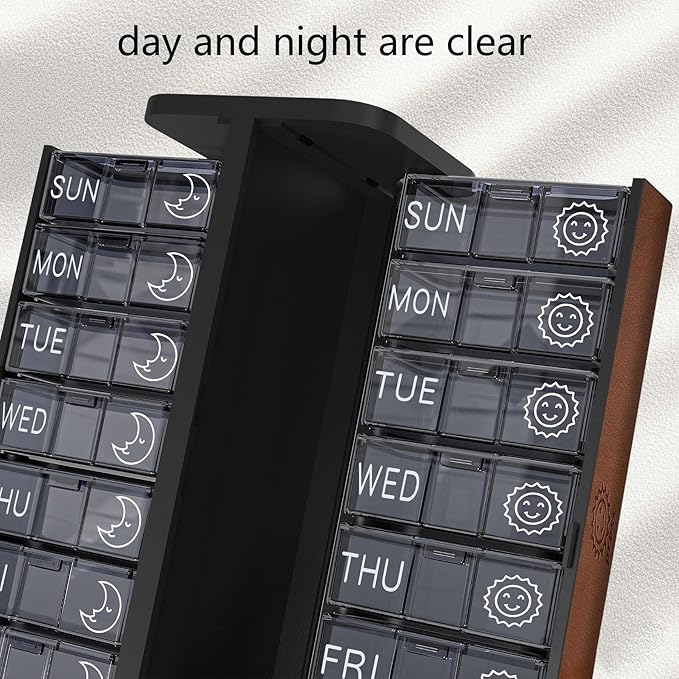 - Detachable twice a day pill reminder organizer,1:just take what you need with you if you'd like. 2:rearrange the days as you like. 3:wash each little case easily.The travel pill organizer has two separate secret compartments; one for morning and one for evening. Each compartment has seven different pill container and the container has a nice depth which can accommodate various pill sizes. The pill case also offer a view of the medication inside, and the days of the week are easy to read