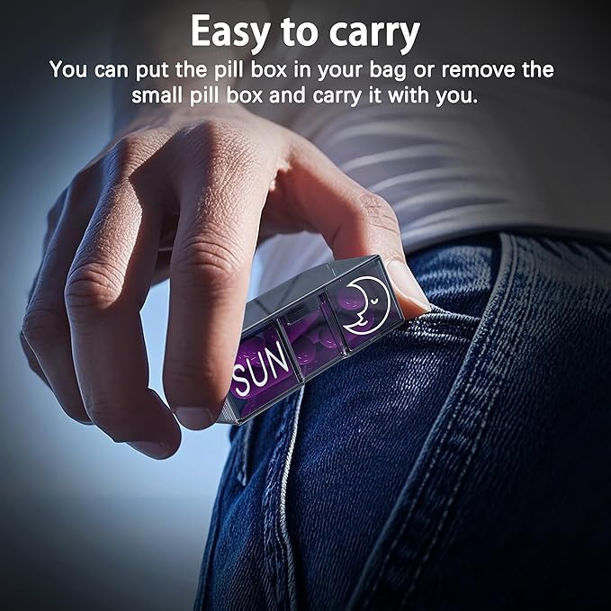 - Detachable twice a day pill reminder organizer,1:just take what you need with you if you'd like. 2:rearrange the days as you like. 3:wash each little case easily.The travel pill organizer has two separate secret compartments; one for morning and one for evening. Each compartment has seven different pill container and the container has a nice depth which can accommodate various pill sizes. The pill case also offer a view of the medication inside, and the days of the week are easy to read