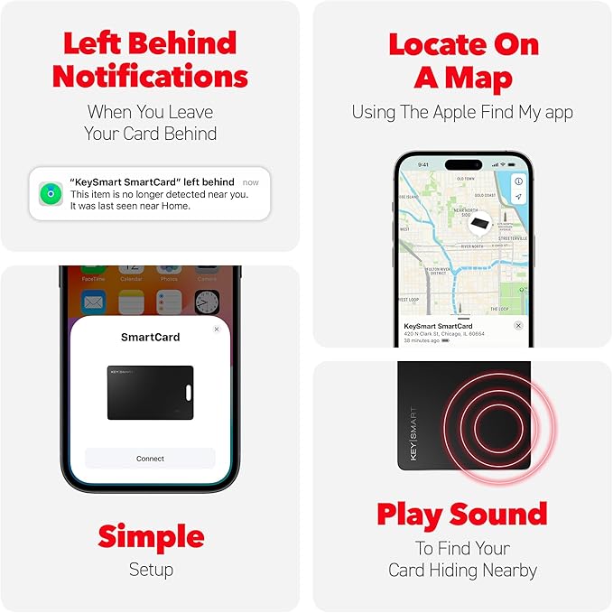 - Get Notified When You Leave It Behind and Lost Mode Helps you Get it Back. The Apple Find My app proactively prevents you from losing your wallet or ID card by sending notifications to your iPhone, CarPlay, or AirPods if you leave your SmartCard behind. With Apple's advanced encryption system you have built in privacy that ensures your KeySmart Card won't be tracked by other people.