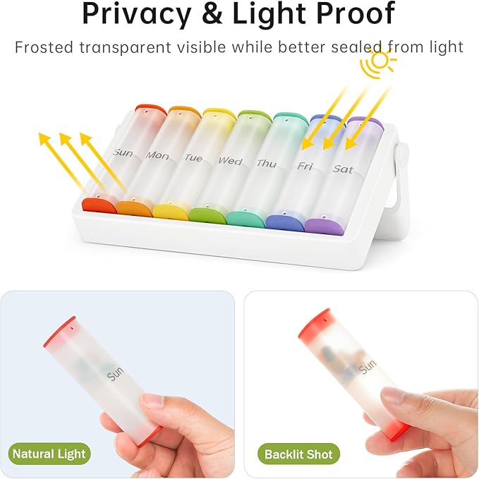 - Original Design: KOVIUU Weekly Pill Organizer features an Semi-transparent design that allows you to better track the usage of your medication. The frosted transparent pill box effectively shields your medicines from direct sunlight, preserving their potency and properties, ensuring your pills stay fresh and extending their shelf life