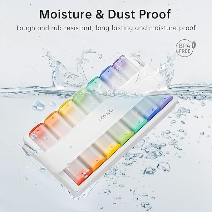 - Easy to Use: Each compartment of the KOVIUU medicine organizer is equipped with a small silicone cap, providing easy and hygienic access. The caps securely seal and protect your medication, ensuring a waterproof and moisture-resistant environment. And the molding process makes the digital labels of the medication organizer never lose their color, keep you to easily track your daily medication takes