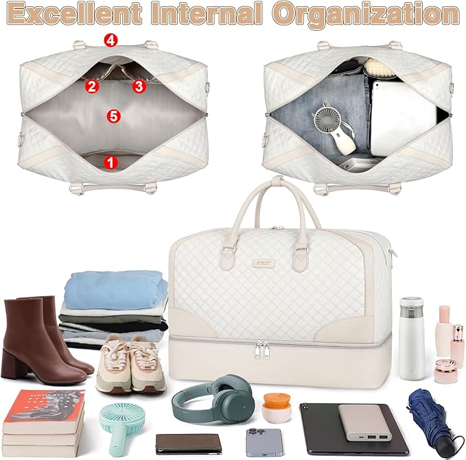 - LARGE WEEKEND BAG FOR WOMEN - The travel bag featuring multiple pockets and compartments for stuff organization, roomy space can fit in 3-5 days of travel essentials, easily fit into your clothes, toiletries, shoes, laptop(up to 17 inch) and other items. In the back of the duffle bag there is a pocket for easy access your smart phone, IDs or passport. Featuring with classy and gorgeous appearance, Our travel duffel bags reach morden urban ladies greatest demand and fantasy on travel bag.
