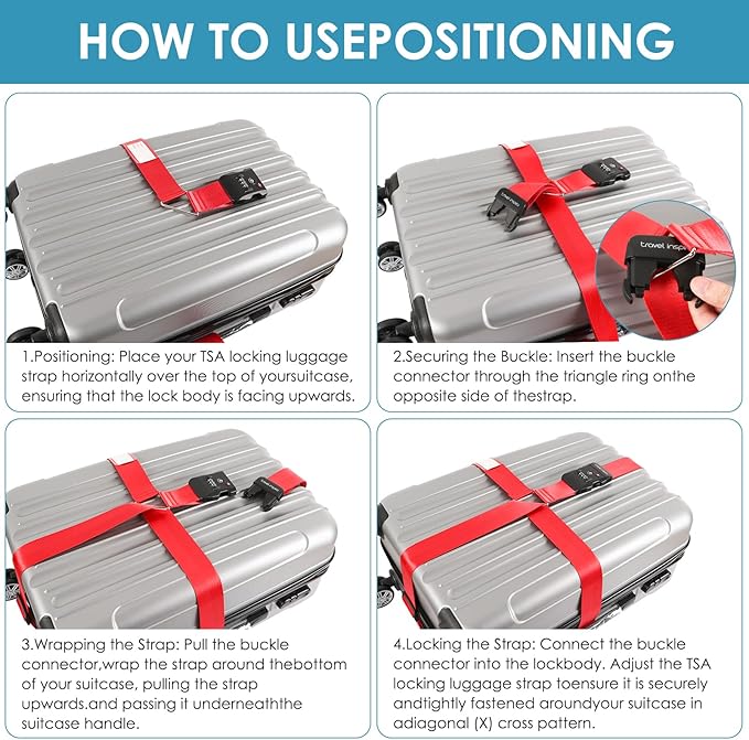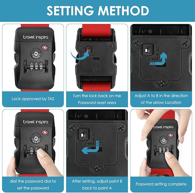 - TSA - Approved Security for Hassle - Free Travel:Our luggage straps feature a TSA - approved 3 - dial combination lock, eliminating the fear of airport security cutting your straps during inspections. No need to fumble with keys; simply set your own combination for added convenience. Rest easy knowing your luggage and belongings are protected from unauthorized access on any journey, whether it's a business flight, a family vacation, or a cruise(The product does not include a TSA lock key).
