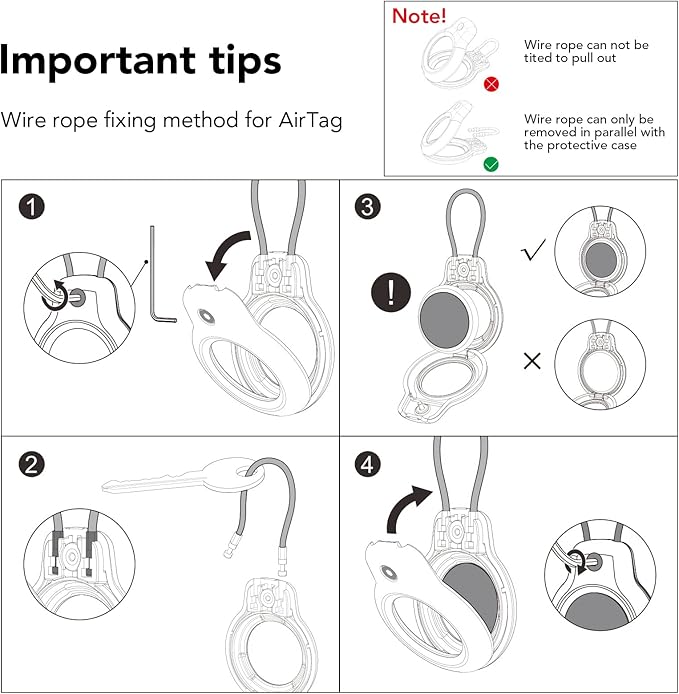 - [DO NOT INCLUDE AIRTAG]This Airtag Holder with Wire Cable provides enhanced security measures to guarantee constant protection for your AirTag. The Air Tag holder also includes a hex key that locks the AirTag firmly in position, allowing you to showcase its elegant design without compromising its security. Men Women's Keyrings & Keychains air tagholder
