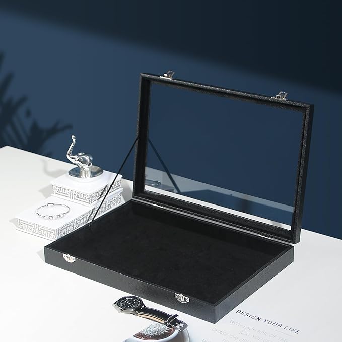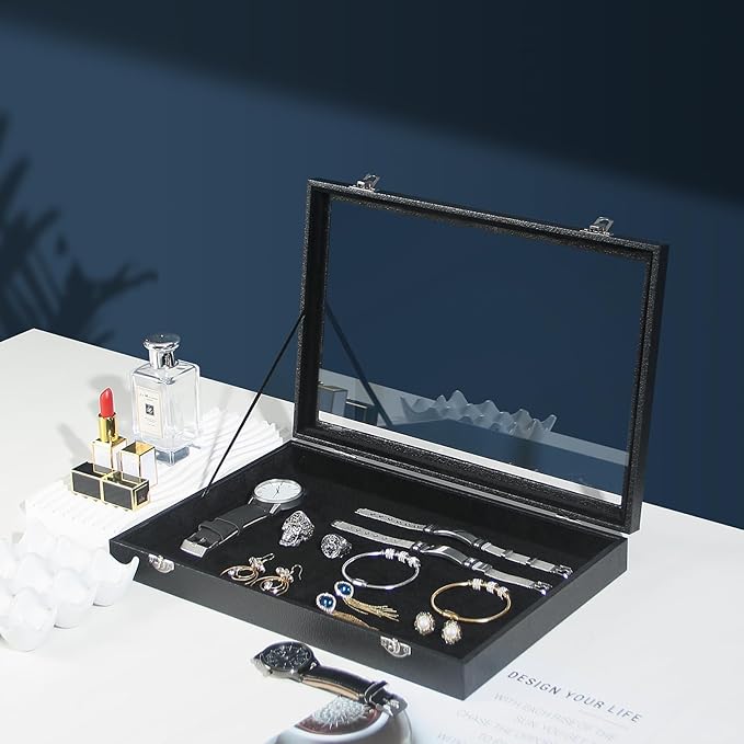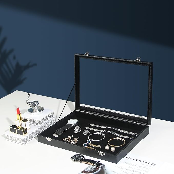 - Instead of cheap plastic lid, we us thick clear glass window at the top of the jewelry case, that allows you to see all the jewelry at a glance.
